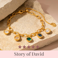 Inspirada en la historia de David — un recordatorio de que todos llevamos las piedras de la fe en nuestro corazón. Así como David enfrentó a su gigante con cinco piedras en la mano, nosotros enfrentamos los nuestros con cinco virtudes en el alma. Esta pulsera representa la fortaleza que nace cuando confiamos más en el poder de Dios que en el nuestro.